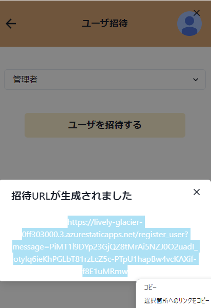 5. 招待URLが生成されるのでコピーして、招待される方にお伝えください